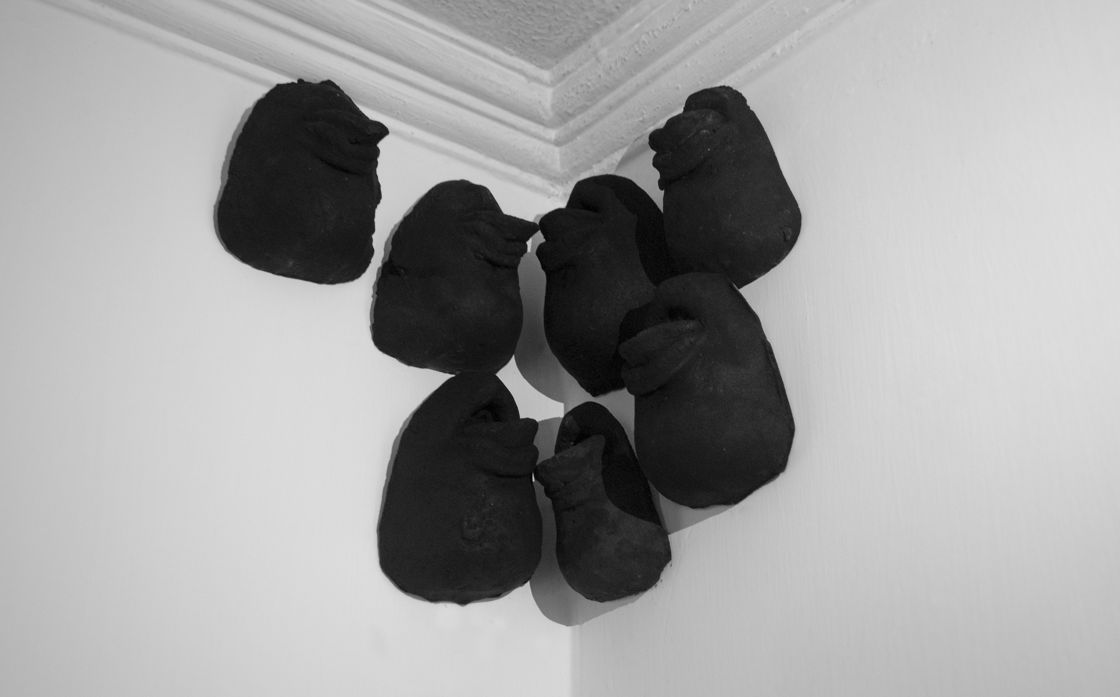 This work is a plaster cast of a protruding tongue, blackened by India Ink with a title and form referencing the iconic mother goddess of creation and destruction, Kali, known for her dark complexion and outstretched tongue. The multiple opposing explanations of the goddess’s tongue sticking out capture the conflicted responses, that not just contemporary India, but any society has to a feminine symbols of power. One story explains that the goddess is in such a fit of rage, madness, and blood-thirst, that like a crazed animal her tongue lolls out, while another explains that in an attempt to stop the goddess’s rampage, her husband lay in her path and Kali stopped short and bit her tongue in embarrassment upon accidentally stepping on her husband’s body. Kali’s protruding tongue explained in terms of rage or shame simultaneously upsets and reinforces our notions of the feminine. On the metaphysical register, Kali signifies the First Principle of the universe which is the power of language or sound of the phonemes.