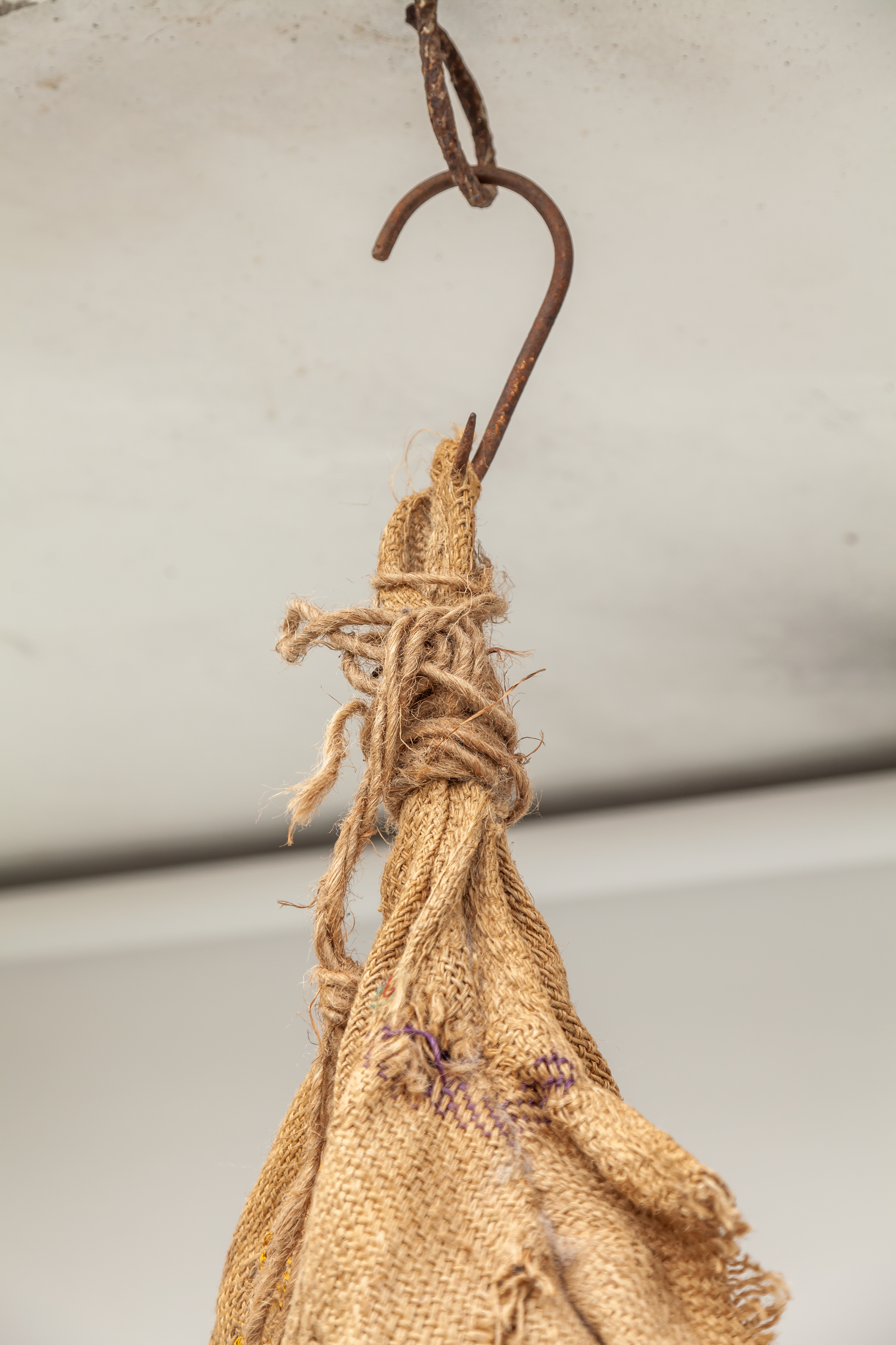 In this work, finer, softer and more colorful fabric is glimpsed through lacerations in the coarse, monochromatic texture of used jute bags that are scarred, swollen, and stained– setting up contrasts within and between bodies. The work meditates on the bodies of manual laborers that have been reduced to becoming a marker for zoe— ‘bare’ life— that have no sociopolitical power while other citizens in the community exist as bio— “qualified life”. Hanging from meat hooks these sacks remind us, how bare bodies and bare backs, deprived of dignity, perilously keep themselves stitched together with survival hanging by a thread while economic and biopolitical forces transform them into sites where humanity is regularly butchered, commodified and cannibalized.