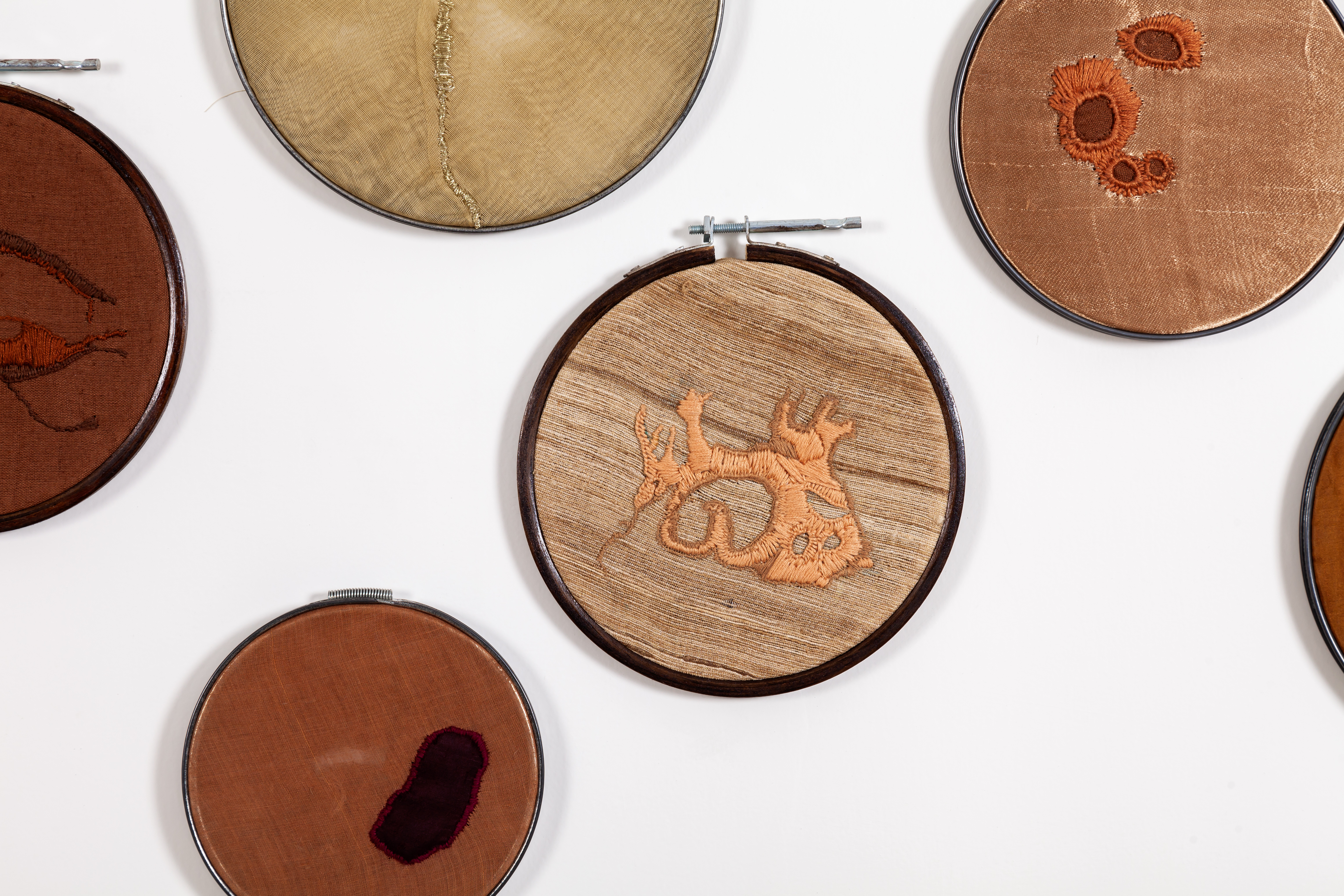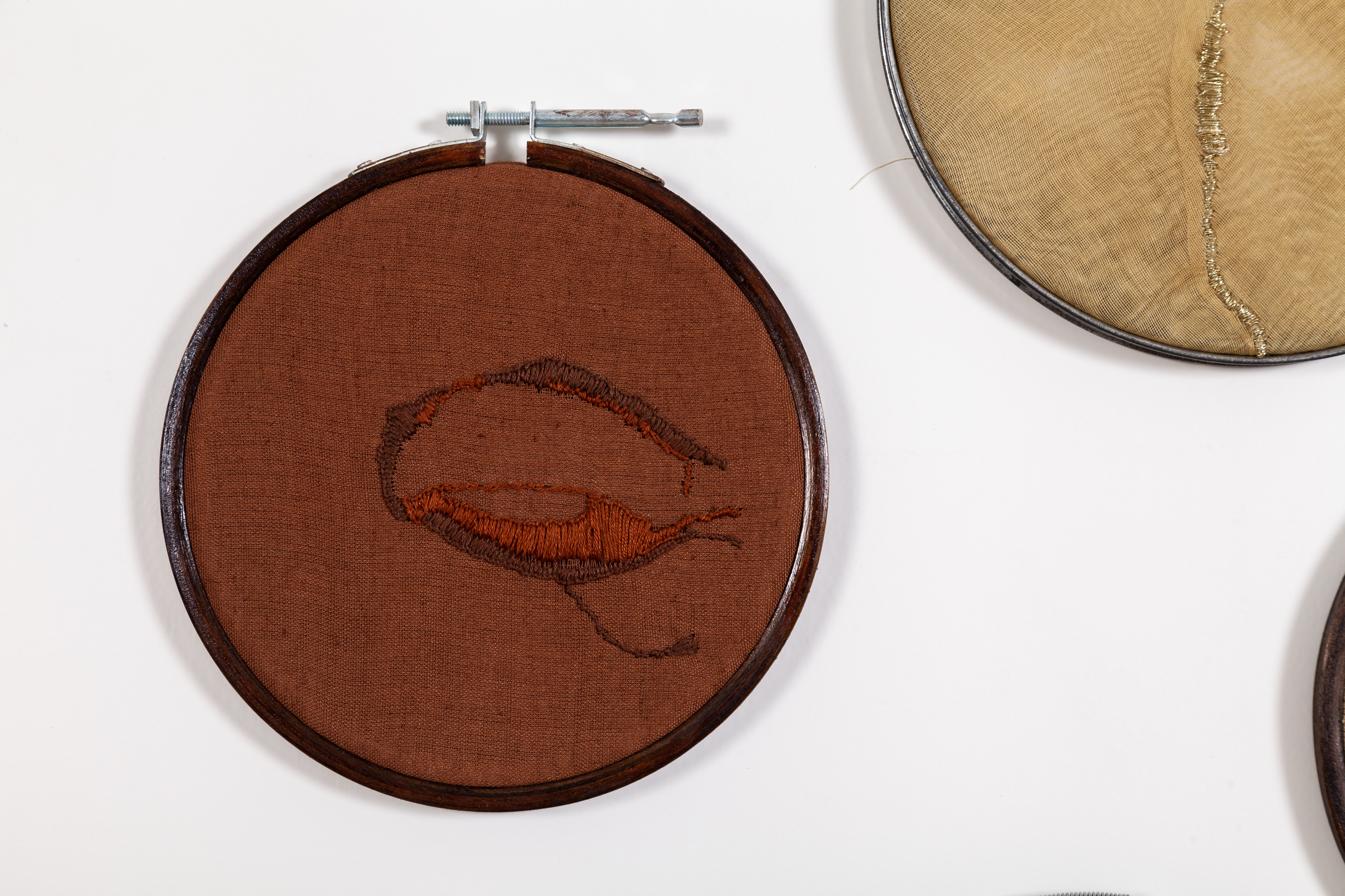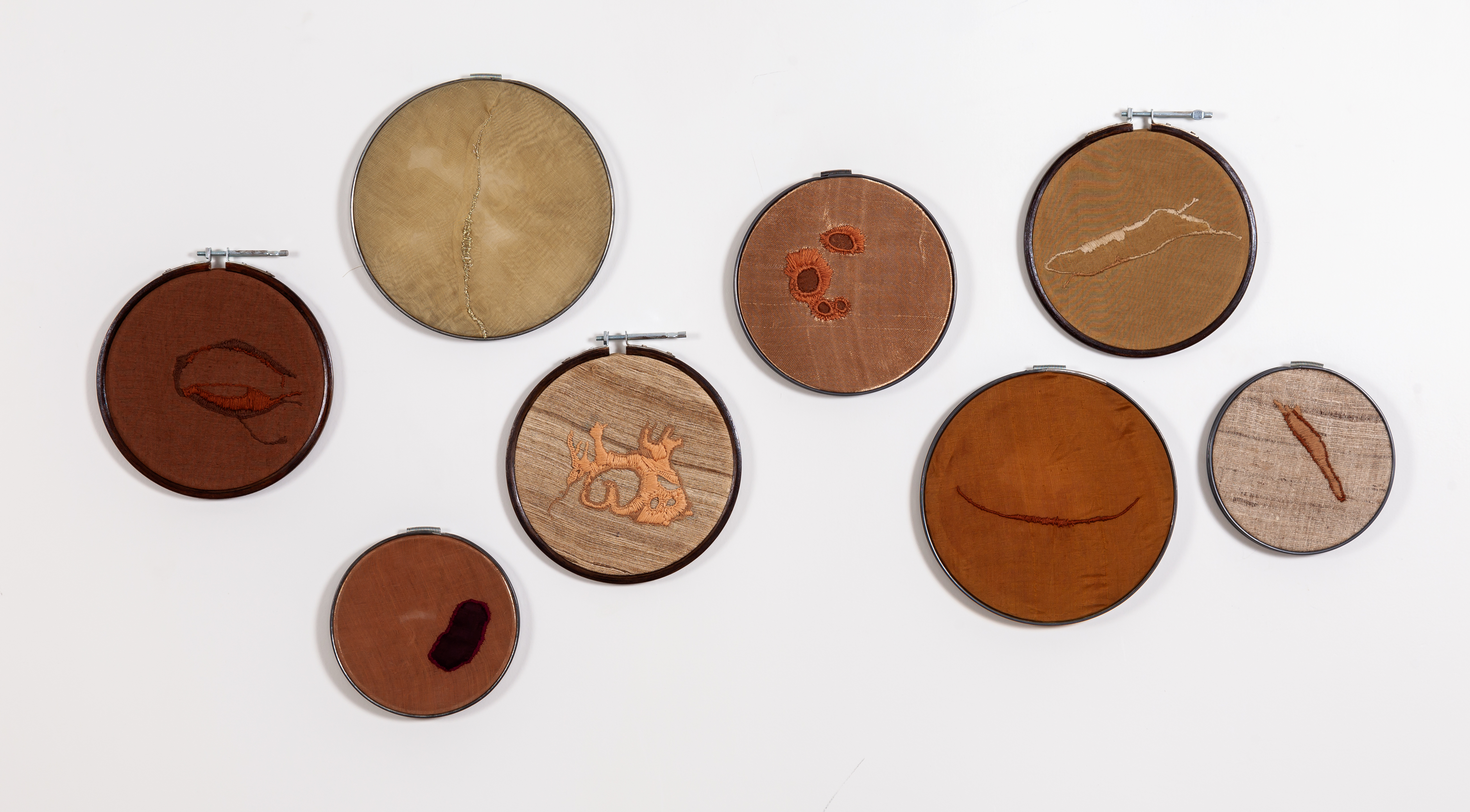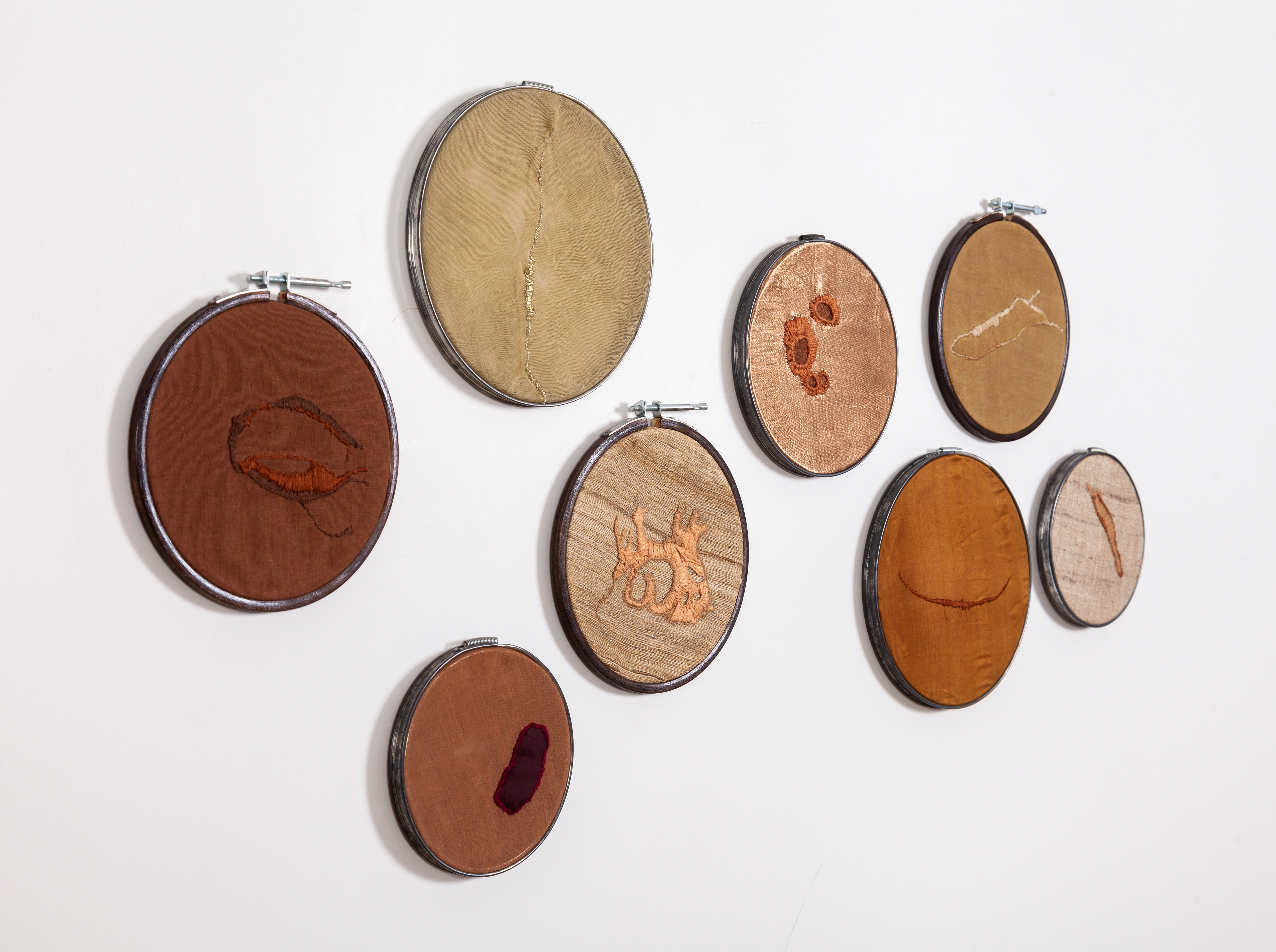 These works capture scars on the bodies of two women who work as manual laborers on construction sites. Delicately hand embroidered onto scrap fabric, the scars are the result of varied domestic and commercial work that these women perform: a blood blister from falling bricks, a burn from boiling water dropped in the kitchen, a scab from a hot welding rod, a scar from a c-section during childbirth. By placing these scars side by side, the work attempts to highlight the physicality of the labor that women do both in and outside the domestic domain. Furthermore, by capturing graphic scars, otherwise very masculine badges of honor, through the form of the feminine act of embroidery, the work attempts to bridge the gap between feminine forms of labor (domestic) and masculine forms of labor (commercial). The women whose bodies display these scars are themselves forced to bridge this divide as economic circumstances force on them the “double day” of performing domestic chores side-by-side with paid manual work. Both beautiful and grotesque at the same time, these scars speak to the way in which both domestic and commercial labor can be simultaneously sites of empowerment and exploitation of the female body.